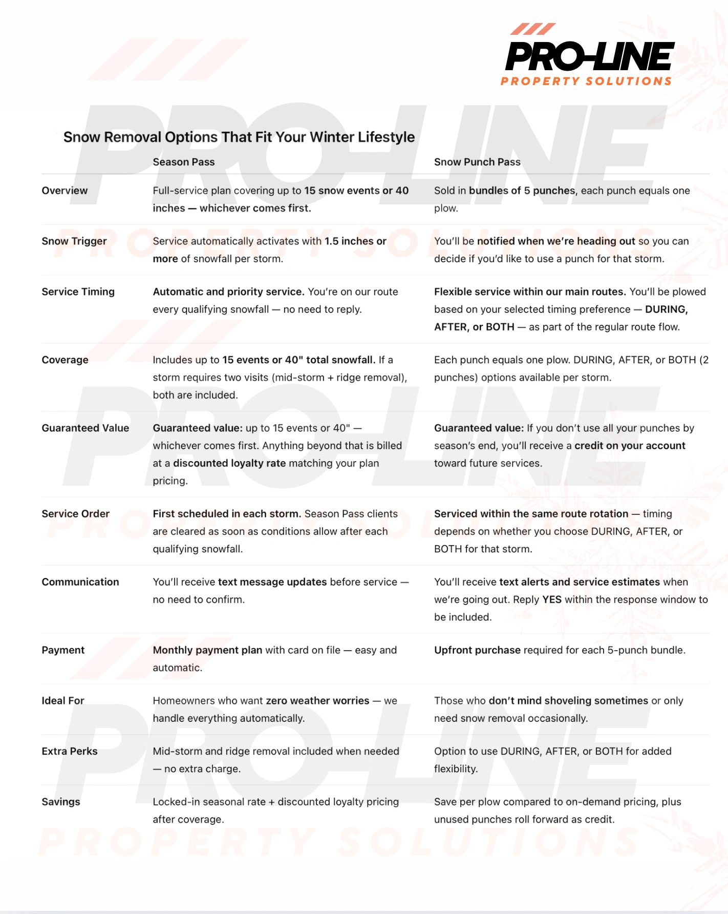 The Snow Punch Pass gives you the flexibility to choose when you want your driveway cleared without committing to a full season or every snow fall. It’s designed for homeowners who don’t mind handling light snow themselves or only need service occasionally — like cabins, rentals, or snowbird properties.